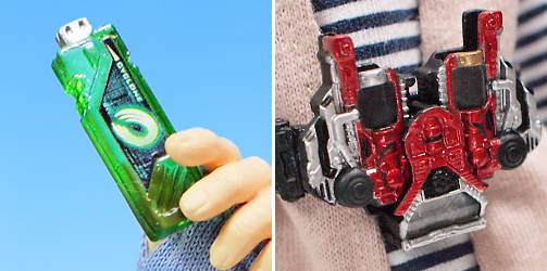 "サイクロン"のガイアメモリとダブルドライバー。ダブルドライバーは既存の物と同様にメモリ装填可能で開閉アクションも出来ます。